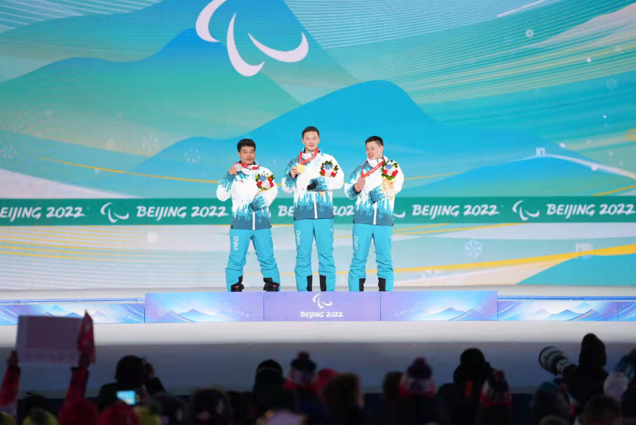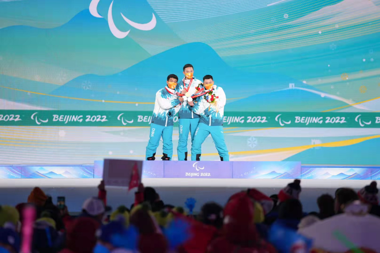 工人日报—中工网记者窦菲涛 3月7日晚,在北京2022年北京冬残奥会张家口赛区颁奖广场,三面五星红旗同时升起,嘹亮的国歌响彻夜空,中国选手纪立家、王鹏耀和朱永钢包揽单板滑雪男子障碍追逐(UL级)金银铜牌。这也是本届冬残奥会上第一次同时升起三面五星红旗。
