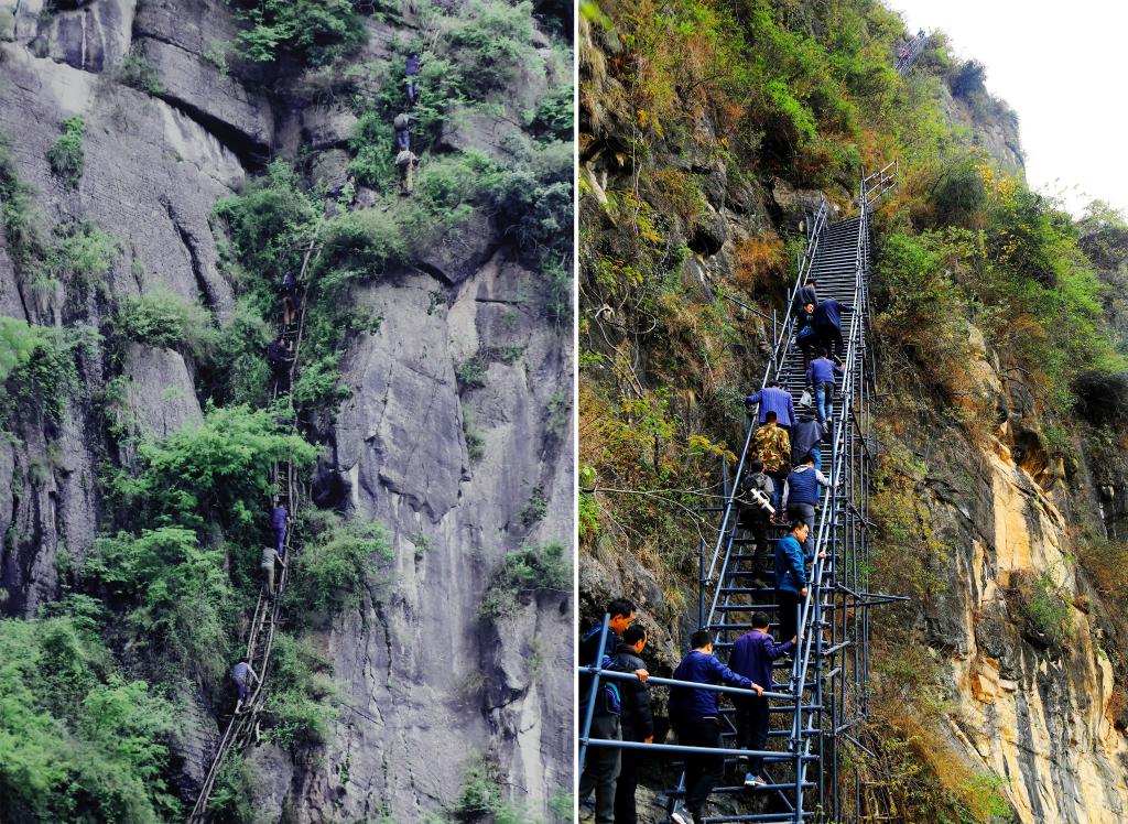 悬崖峭壁上,一个是歪歪扭扭的简易藤梯,另一个则是改建后同时用于旅游的钢梯。