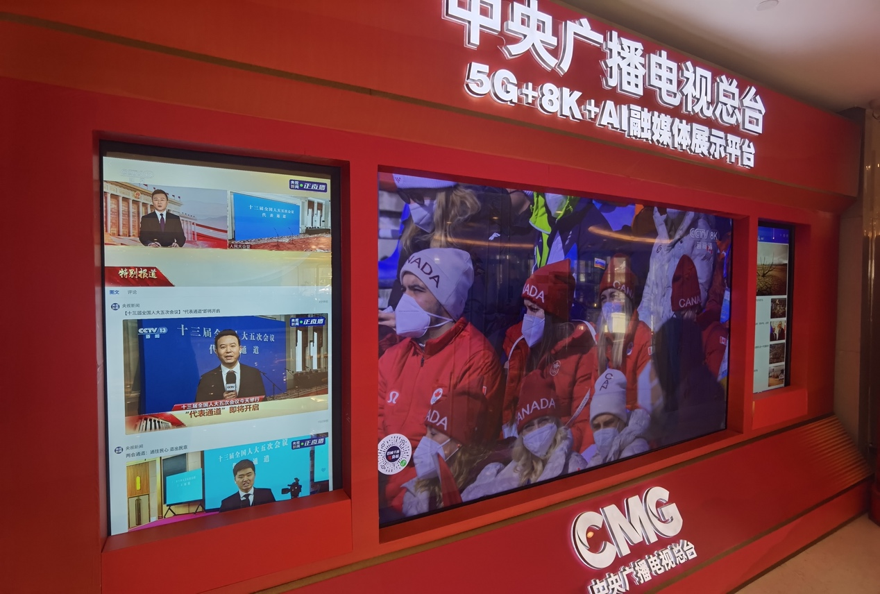 在梅地亚新闻中心,总台的5G+8K+AI融媒体展示平台前,经常聚集着很多人。通过这个平台,人们可以观看总台制作的节目、转播的体育比赛以及记者在各个新闻前线发起的新媒体直播,总台高科技服务着全国两会新闻中心的每一个人。
