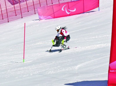 中国选手刘思彤在7日举行的北京冬残奥会高山滑雪女子全能比赛(超级大回转+回转)坐姿组获得铜牌。图为刘思彤在回转比赛中冲过最后一个旗门。刘博超摄/光明图片