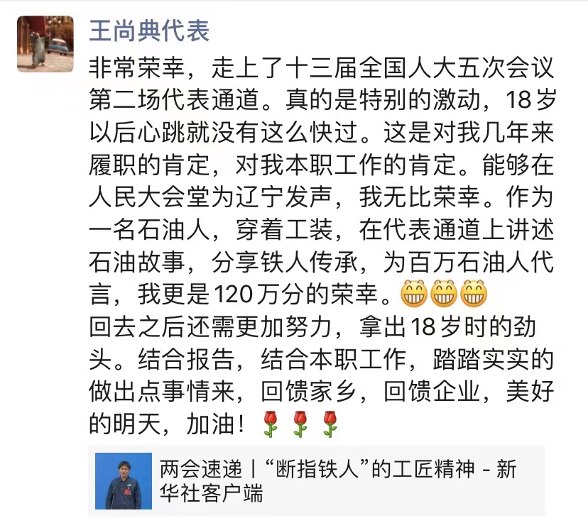 王尚典透露,自己在“代表通道”上讲述也引发了身边同事的共鸣,自己手机上收到很多同事发来的信息,除了对自己表示祝贺、送上祝福,大家纷纷表示,倍感振奋,深受鼓舞,今后将不断提升专业技能,用实际行动践行工匠精神。