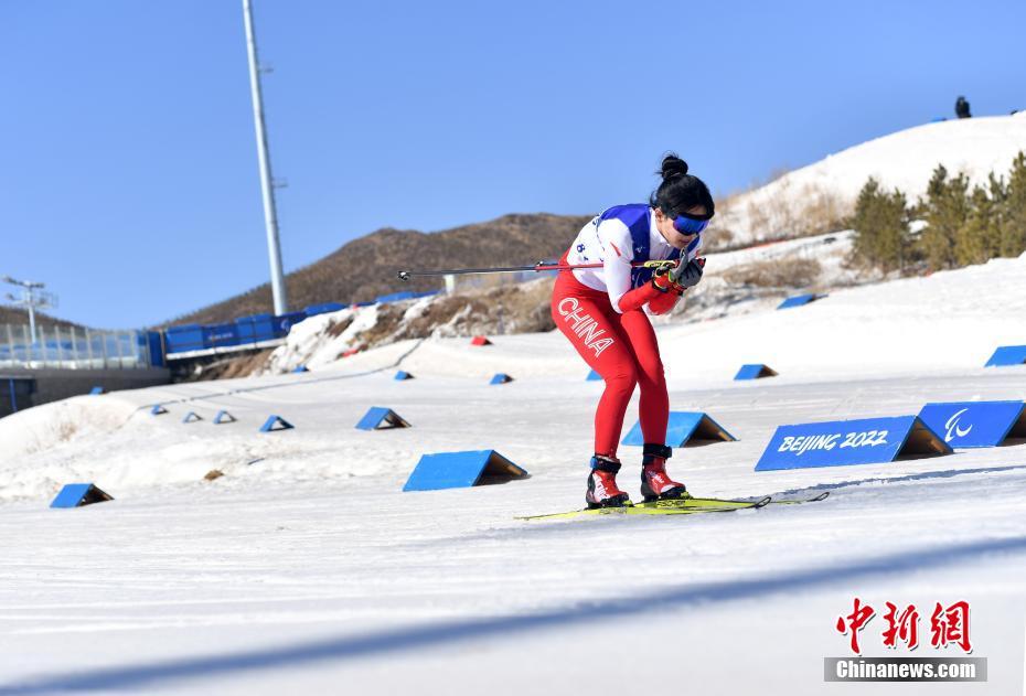 3月8日,中国选手王跃在比赛中。当日,北京2022年冬残奥会残奥冬季两项女子中距离-视障比赛在位于张家口赛区的国家冬季两项中心举行。中国选手王跃获得铜牌。 中新社记者 韩冰 摄