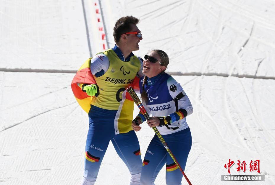 3月8日,德国选手莱奥妮·玛丽亚·瓦尔特(右)获知成绩后庆祝。当日,北京2022年冬残奥会残奥冬季两项女子中距离-视障比赛在位于张家口赛区的国家冬季两项中心举行。德国选手莱奥妮·玛丽亚·瓦尔特夺得金牌。 中新社记者 韩冰 摄