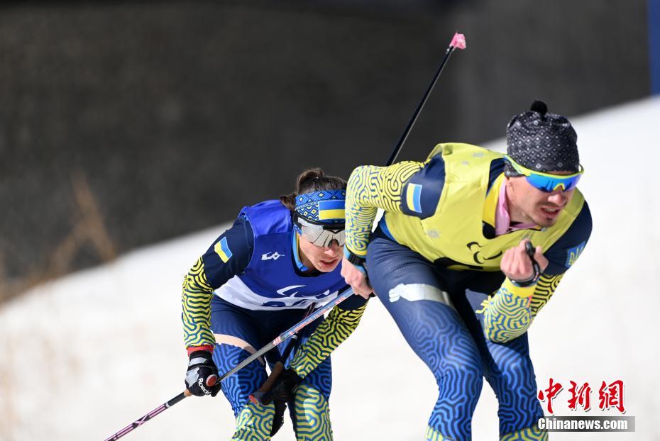3月8日,乌克兰选手奥克萨娜·希什科娃在比赛中(左)。当日,北京2022年冬残奥会残奥冬季两项女子中距离-视障比赛在位于张家口赛区的国家冬季两项中心举行。乌克兰选手奥克萨娜·希什科娃获得银牌。 中新社记者 韩冰 摄