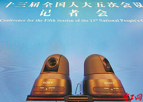 位于梅地亚新闻中心的高清摄像头和高清LED屏,可以连接北京人民大会堂主会场。本报记者 杨登峰 摄