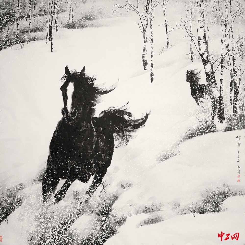 《踏雪》(国画,200cm×200cm),作者傅东明,“冰雪情·冬奥梦”全国职工冰雪主题绘画活动入围奖作品