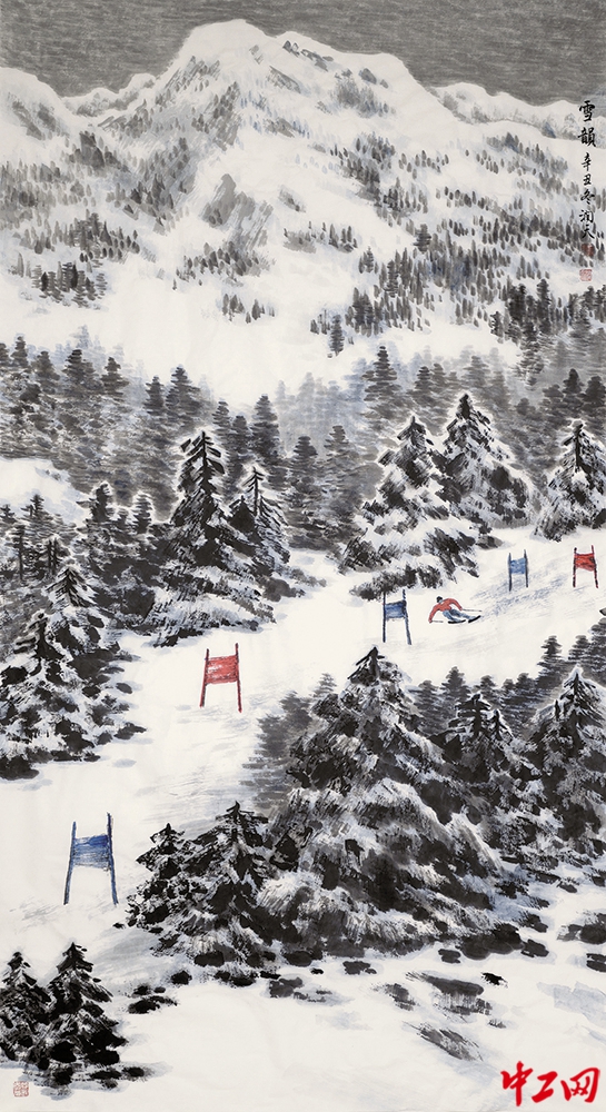 《雪韵1》(国画,97cm×180cm),作者周润天,“冰雪情·冬奥梦”全国职工冰雪主题绘画活动优秀奖作品