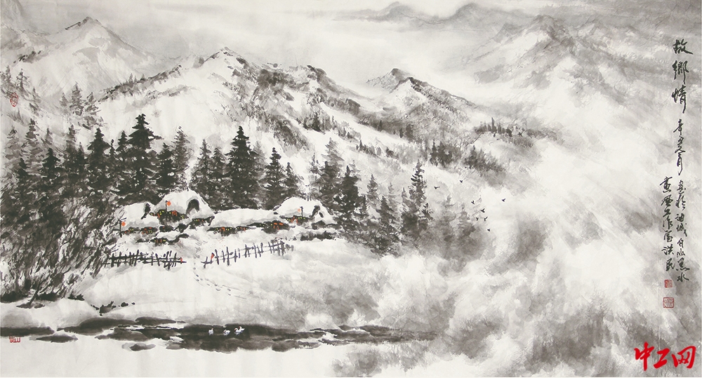 《故乡情》(国画,180cm×97cm),作者董洪民,“冰雪情·冬奥梦”全国职工冰雪主题绘画活动优秀奖作品