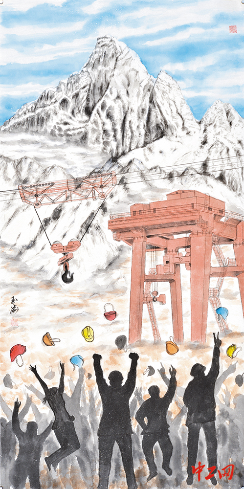 《雪域工匠 喝彩冬奥》(国画,69cm×138cm),作者庞玉涛,“冰雪情·冬奥梦”全国职工冰雪主题绘画活动优秀奖作品