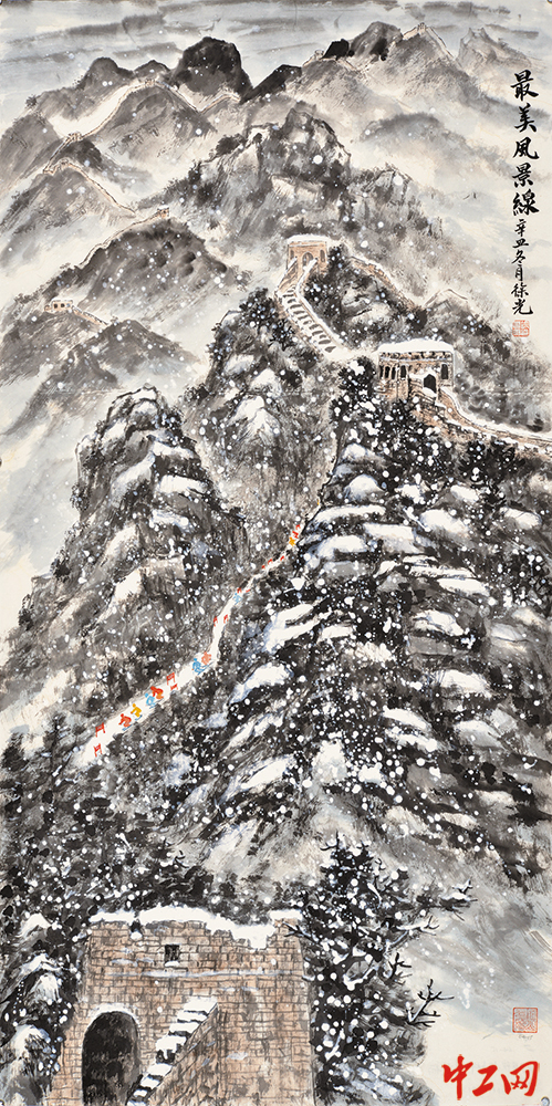 《最美风景线》(国画,69cm×138cm),作者徐光,“冰雪情·冬奥梦”全国职工冰雪主题绘画活动优秀奖作品