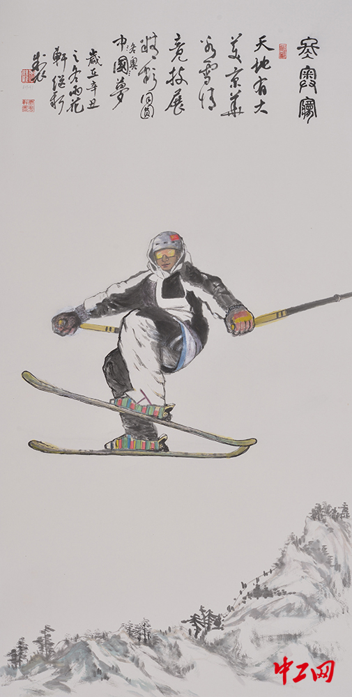 《冬奥梦 2》(国画,69cm×138cm),作者李继新,“冰雪情·冬奥梦”全国职工冰雪主题绘画活动优秀奖作品