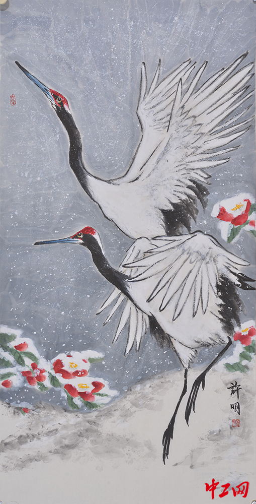 《腾凤舞雪》(国画,69cm×168cm),作者许明,“冰雪情·冬奥梦”全国职工冰雪主题绘画活动优秀奖作品