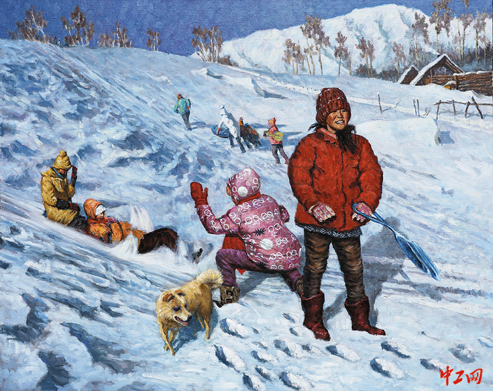 《冰雪乐》(国画,150cm×120cm),作者李本昌,“冰雪情·冬奥梦”全国职工冰雪主题绘画活动优秀奖作品