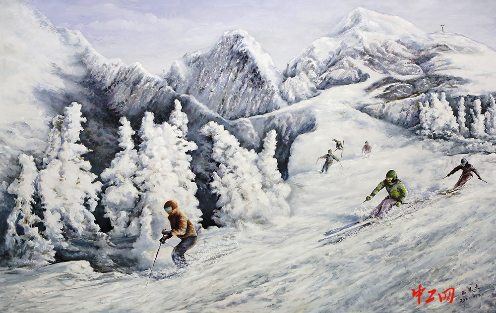 《超越》(油画,220cm×140cm),作者巩建文,“冰雪情·冬奥梦”全国职工冰雪主题绘画活动优秀奖作品
