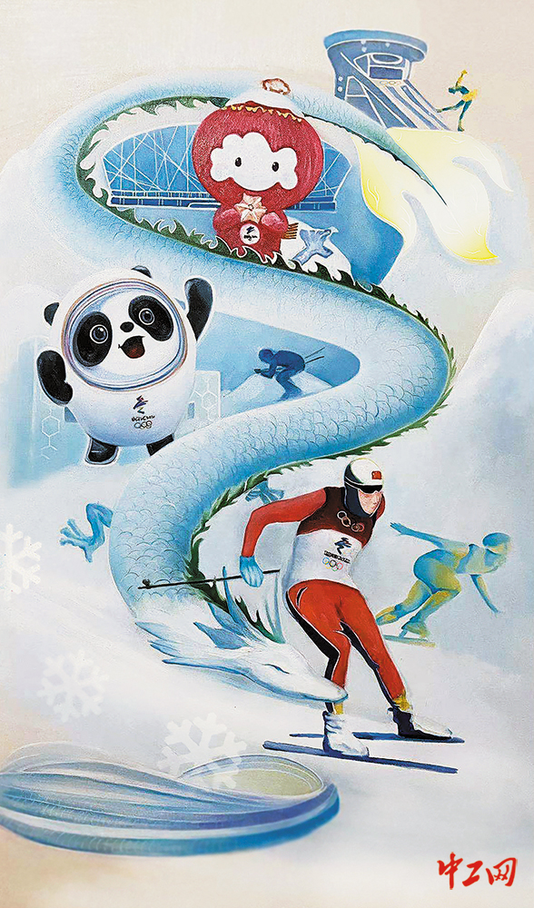 《共赴冰雪之约 为北京冬奥加油》(油画,70cm×120cm),作者吴小洪,“冰雪情·冬奥梦”全国职工冰雪主题绘画活动优秀奖作品