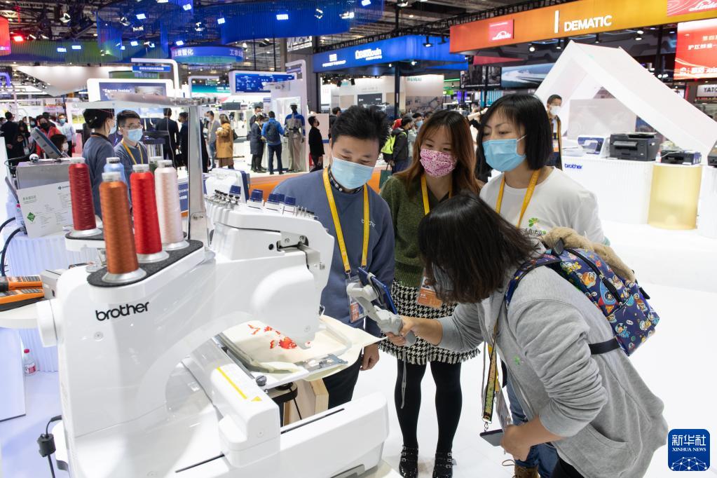 这是2021年11月8日拍摄的进博会技术装备展区的日本Brother集团展台。(新华社记者孟涛摄)