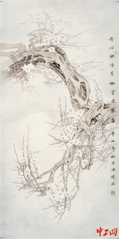 《丹心映冷月 傲骨迎寒香》(国画,67cm×134cm),作者张海娟,“冰雪情·冬奥梦”全国职工冰雪主题绘画活动优秀奖作品