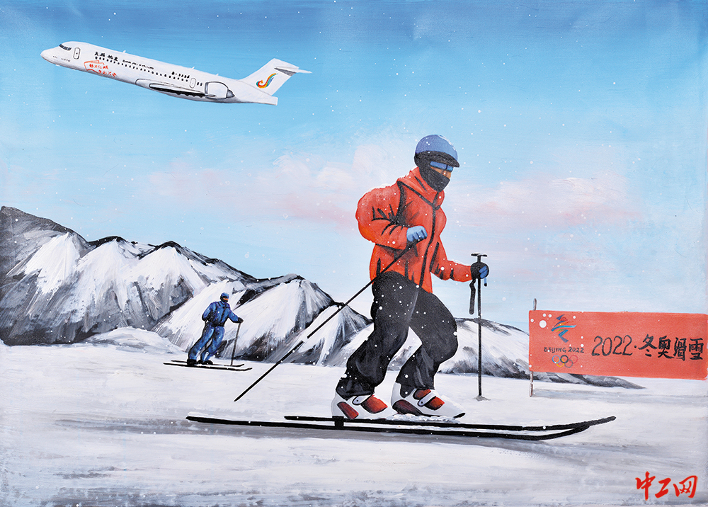 《雪跃风华 祥瑞冬奥》(油画,90cm×60cm),作者于丹,“冰雪情·冬奥梦”全国职工冰雪主题绘画活动优秀奖作品