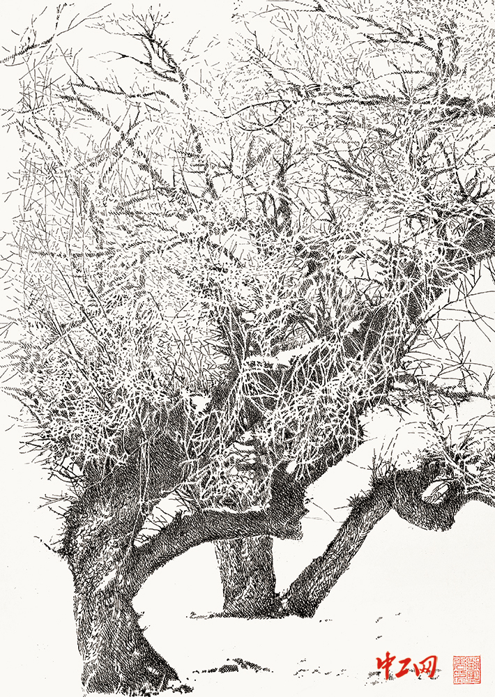 《雪韵2》(水彩钢笔画,29cm×41cm),作者刘军吉,“冰雪情·冬奥梦”全国职工冰雪主题绘画活动入围奖作品