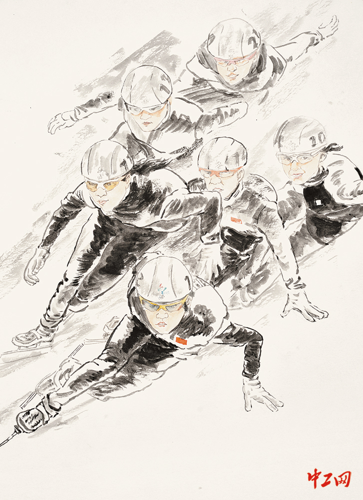 《奔腾舒展跃冰雪》(水彩画,36cm×48cm),作者胡佐君,“冰雪情·冬奥梦”全国职工冰雪主题绘画活动入围奖作品