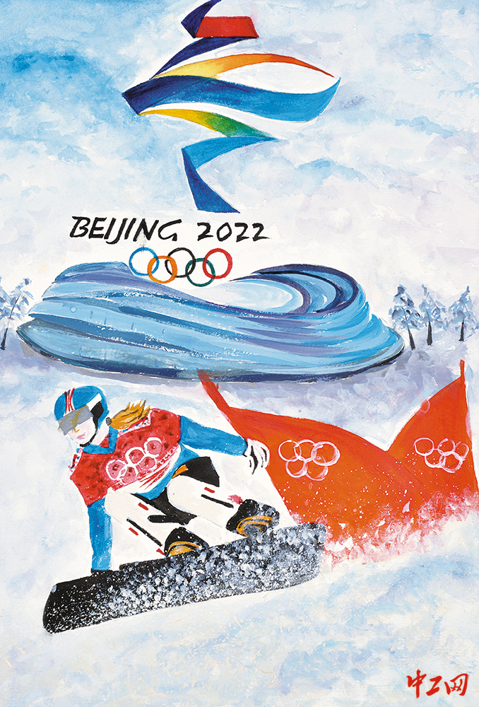 《冰雪情 冬奥梦》(水彩画,25cm×36cm),作者聂昭宇,“冰雪情·冬奥梦”全国职工冰雪主题绘画活动入围奖作品