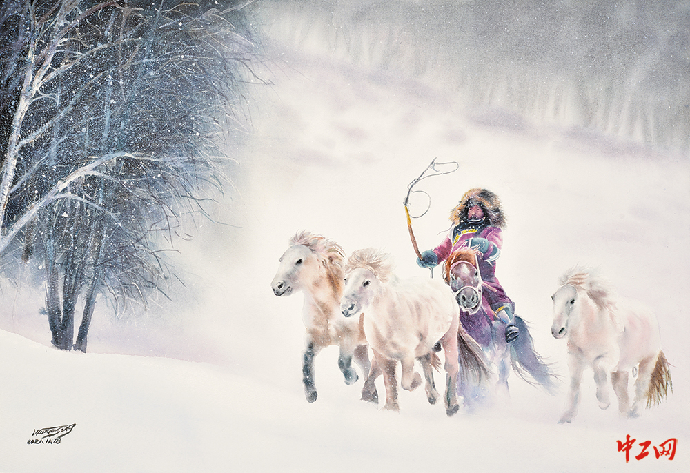 《风雪牧归》(水彩画,78cm×54cm),作者邬雪松,“冰雪情·冬奥梦”全国职工冰雪主题绘画活动优秀奖作品