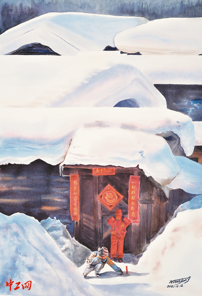《过新年》(水彩画,54cm×78cm),作者邬雪松,“冰雪情·冬奥梦”全国职工冰雪主题绘画活动优秀奖作品