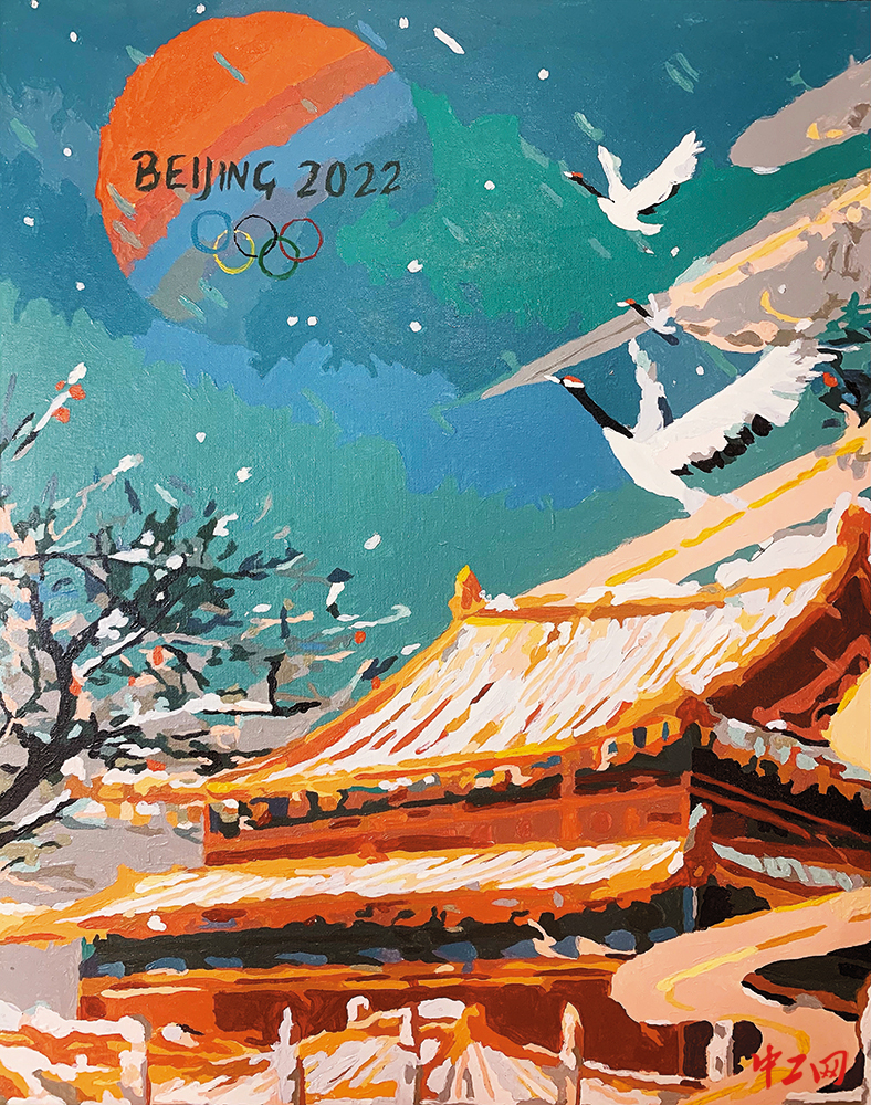 《喜迎冬奥2》(油画,40cm×50cm),作者李芳,“冰雪情·冬奥梦”全国职工冰雪主题绘画活动入围奖作品