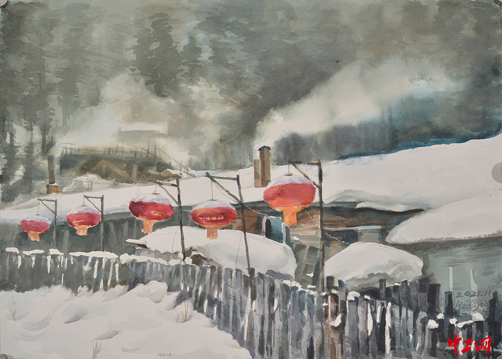 《人归暮雪时》(水彩画,53cm×38cm),作者何大勇,“冰雪情·冬奥梦”全国职工冰雪主题绘画活动入围奖作品