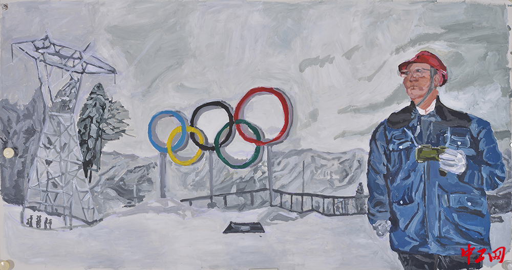 《黎明出发 点亮未来》(水粉画,180cm×97cm),作者牛瑞峰,“冰雪情·冬奥梦”全国职工冰雪主题绘画活动入围奖作品