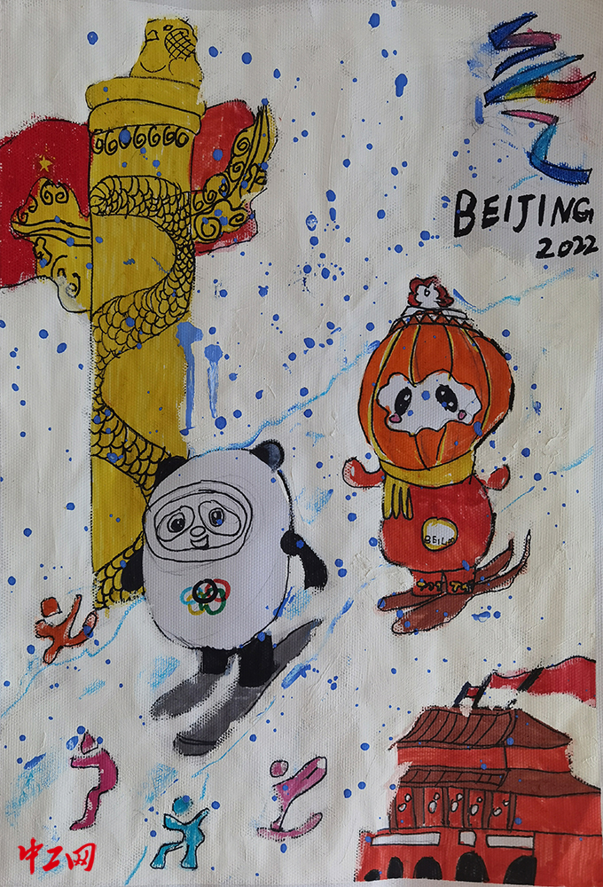 《相约北京,喜迎冬奥》(水粉画,39.3cm×54.6cm),作者张露心,“冰雪情·冬奥梦”全国职工冰雪主题绘画活动入围奖作品