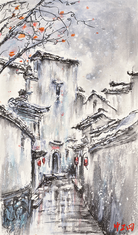 《老街冬日》(版画,15cm×25cm),作者俞嘉琳,“冰雪情·冬奥梦”全国职工冰雪主题绘画展入围奖作品