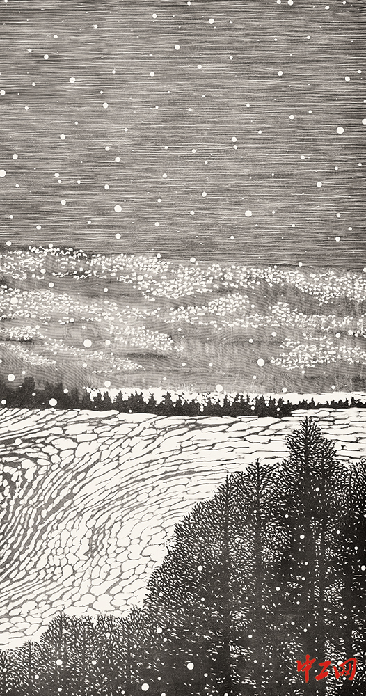 《雪原》(版画,49cm×92cm),作者韩超,“冰雪情·冬奥梦”全国职工冰雪主题绘画展优秀奖作品