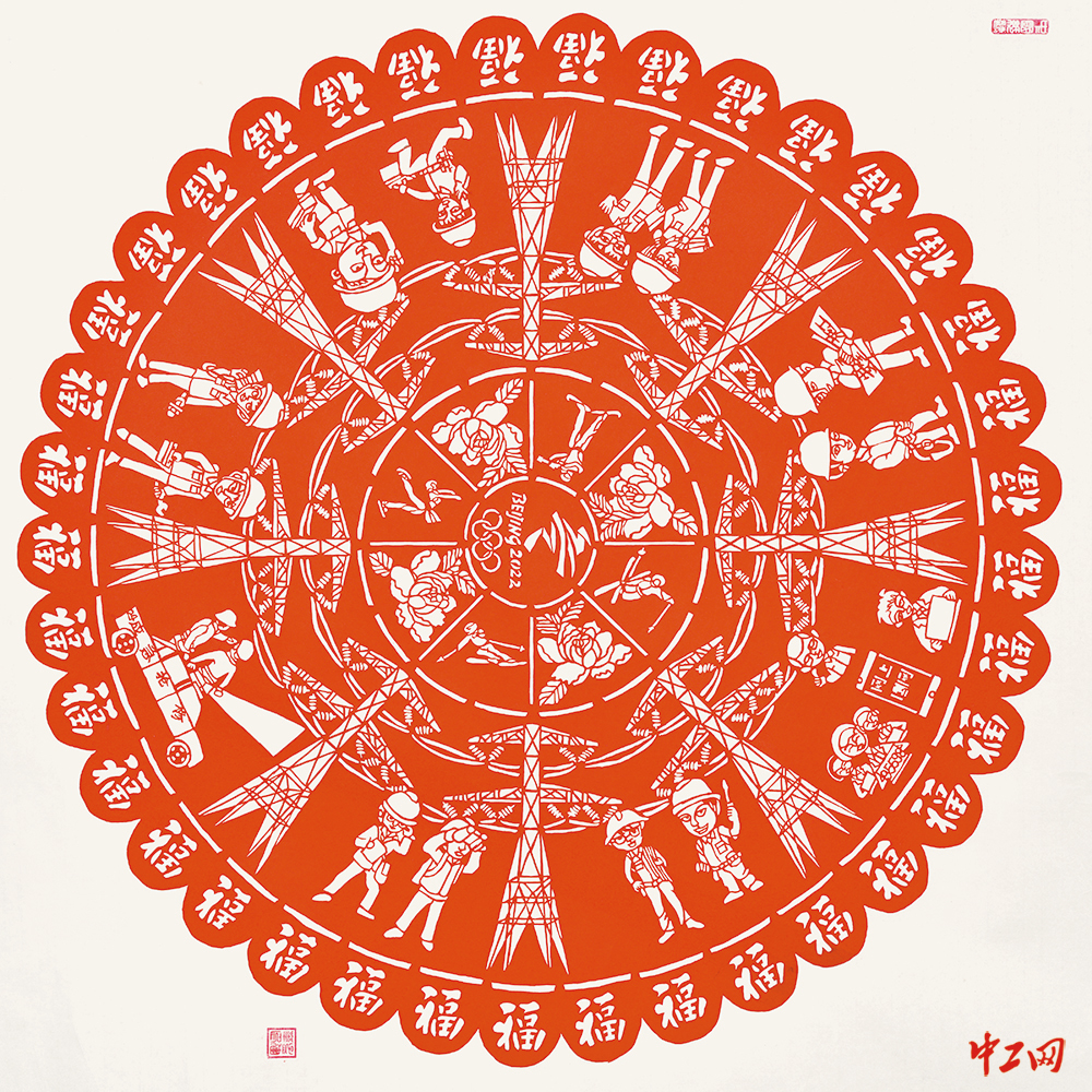 《电力超人》(剪纸,90cm×90cm),作者孟建华,“冰雪情·冬奥梦”全国职工冰雪主题绘画活动入围奖作品