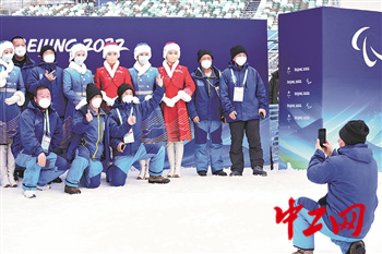 日前,随着残奥单板滑雪男子坡面回转(LL2级)比赛的完赛,北京2022年冬残奥会张家口赛区云顶滑雪公园承担的赛事全部结束。赛后,场馆工作人员和颁奖志愿者合影留念。工人日报-中工网记者 窦菲涛 摄