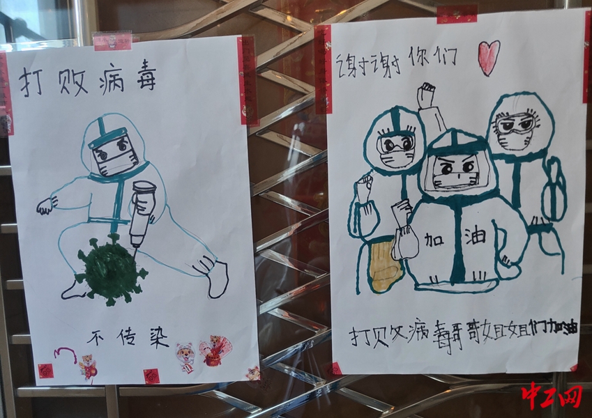 在工作过程中,一位五岁小朋友的感谢卡让在场的志愿者们倍感鼓舞。感谢卡上画着身着防护服的志愿者,并配文“打败病毒”“哥哥姐姐加油”等,以表达对他们的感谢之情。