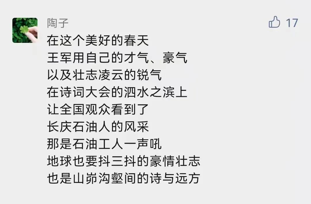 诗词大会季军与石油工人的身份反差,让王军成为当仁不让的“网红”,也让大家看到,石油工人不仅仅守着寂寞和荒凉,也憧憬着诗和远方。