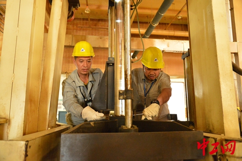 工人对梗打包机压头进行改造 孙惟刚 摄