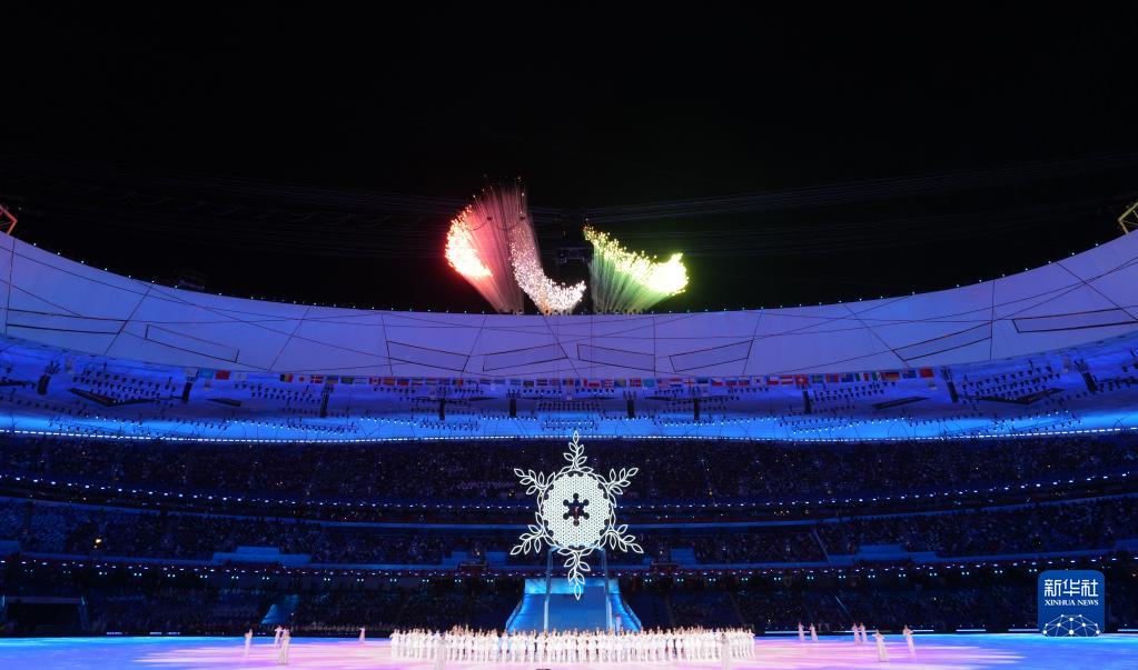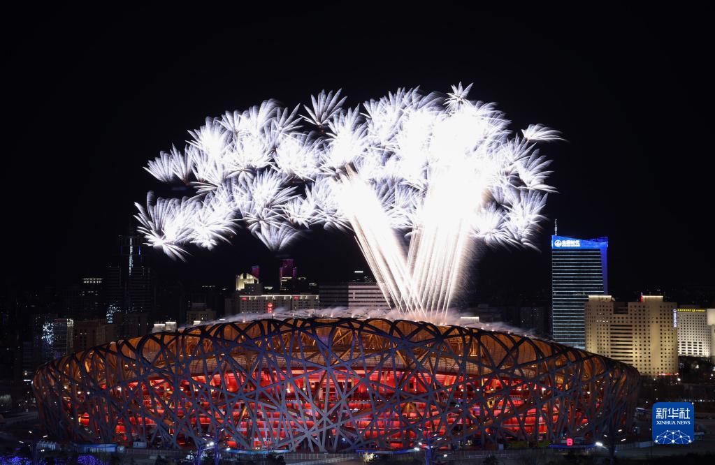 在第二十四届冬季奥林匹克运动会开幕式上,焰火绽放在北京国家体育场上空(2022年2月4日摄)。