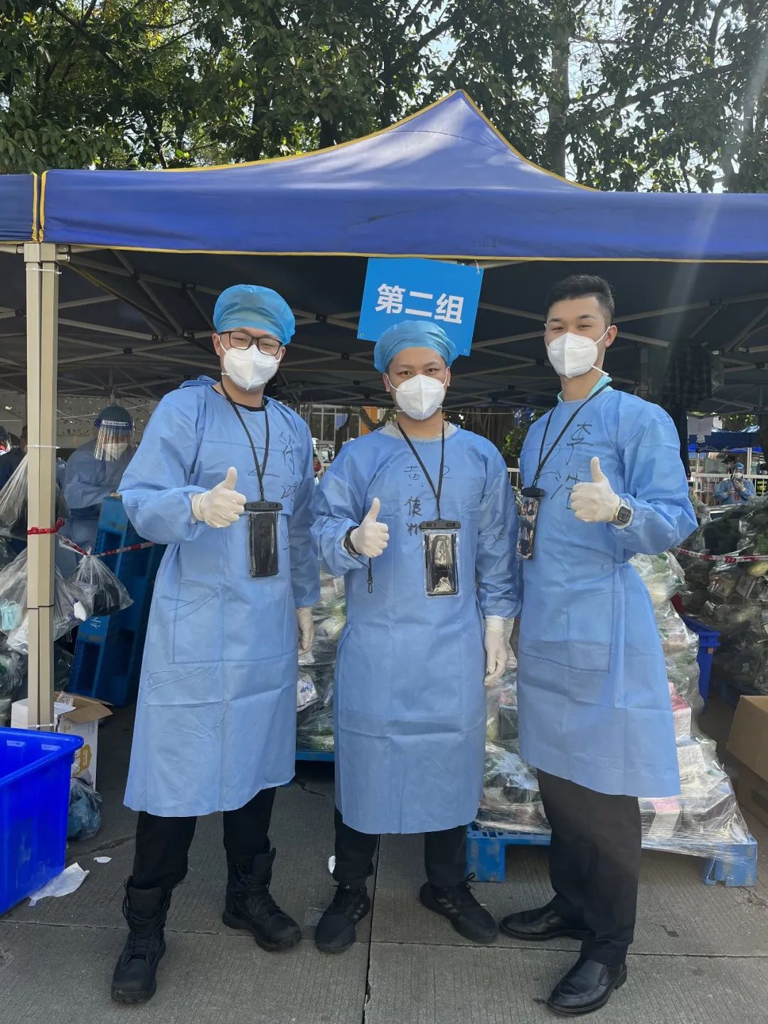 对于快速发放物资,梁才恩他们有诀窍,防护服、手套要提前按照型号分开摆放,防护面罩的塑料薄膜要提前都帮队员们撕开,进封控区做核酸的酒精消毒剂、棉签等物资不好带,他们就想办法领了绳子,帮队员们捆了一个塑料袋做成的“挎包”,每天,他们都提前捆好200个“挎包”。