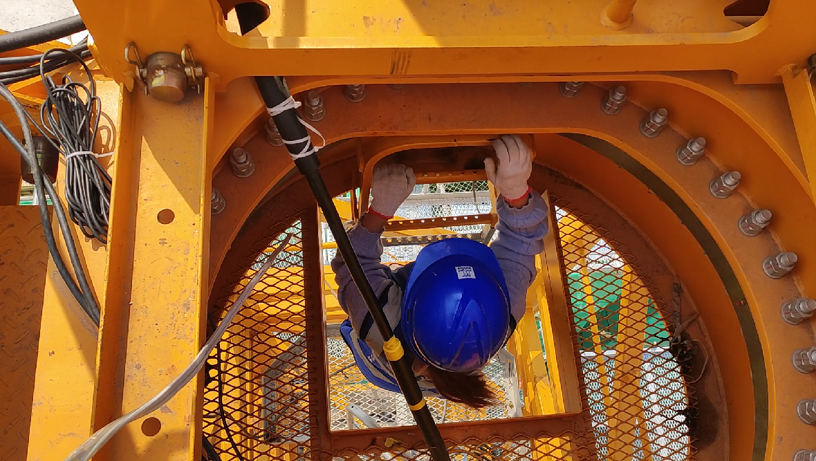 结束安全教育后,彭芳玲开始沿着塔吊通道爬梯向着操作室攀爬,“爬塔吊,手要抓牢,脚要踩稳,格外费力气,有时候上机检查,爬上爬下一趟,感觉胳膊、肩膀都酸痛得不行,不过也正是因为天天这样锻炼,感觉身体都强壮了许多。”彭芳玲自我打趣道。
