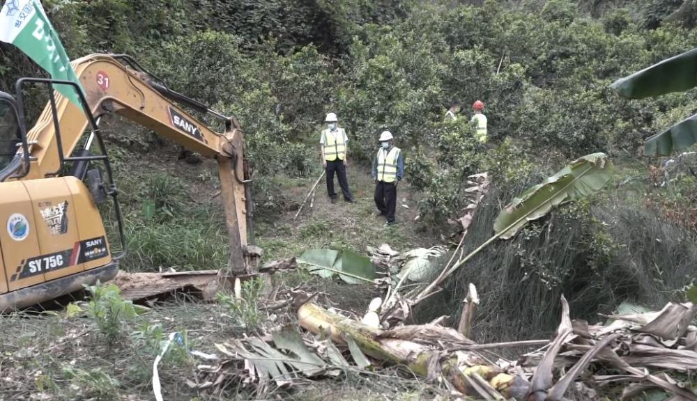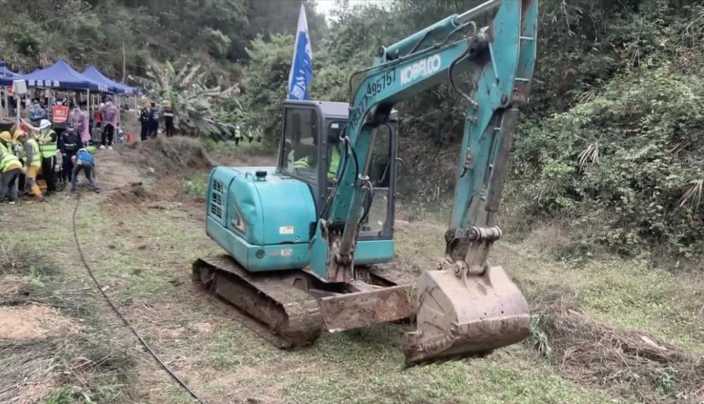 3月22日下午,在广西藤县坠机事故救援现场,救援人员正开辟一条通往事故核心现场的道路,方便后续取物证和搜寻工作,目前已投入6台挖掘机,近50名工作人员参与其中。