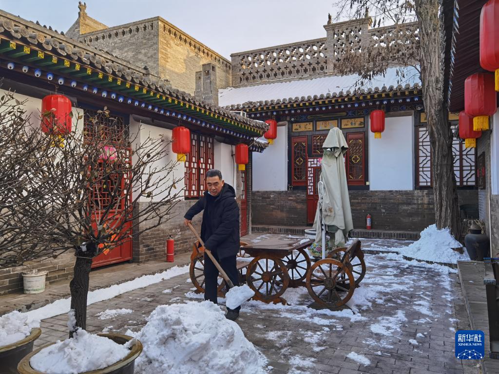 平遥居民范东山在自家的四合院里清理积雪(1月25日摄)。新华社记者 王学涛 摄