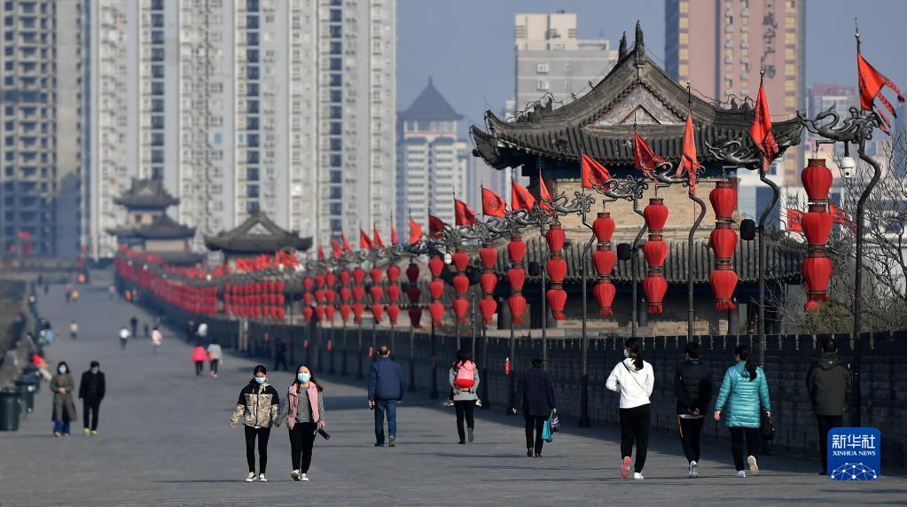游客在西安城墙游览(2020年3月4日摄)。新华社记者 刘潇 摄