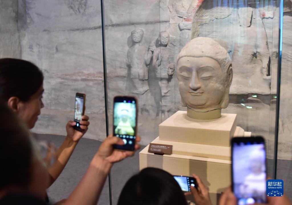 在太原市天龙山石窟博物馆,参观者在拍摄回归的天龙山石窟“第8窟北壁主尊佛首”(2021年7月24日摄)。新华社记者 柴婷 摄