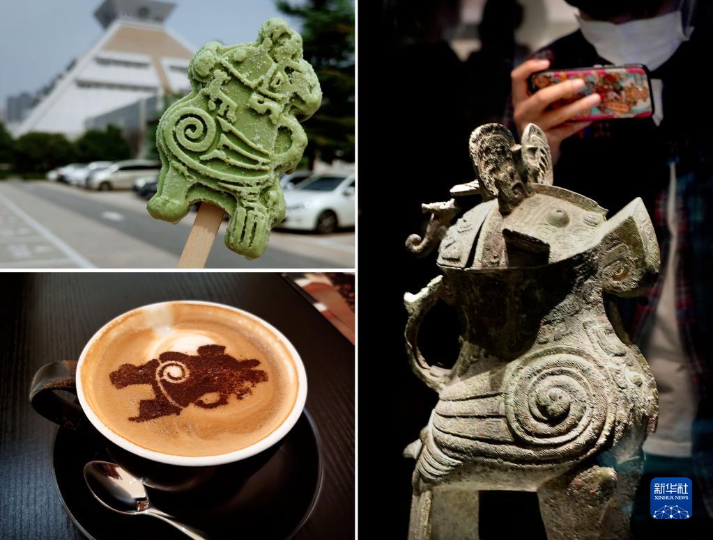 拼版照片:右图为2020年9月24日,参观者在河南博物院主展馆内拍摄展品“妇好鸮尊”(新华社记者 李安 摄);左上图为2020年9月24日拍摄的河南博物院推出的“妇好鸮尊”冰淇淋(新华社记者 李安 摄);左下图为2020年9月24日拍摄的河南博物院推出的“妇好鸮尊”图样咖啡(新华社记者 李文哲 摄)。新华社发