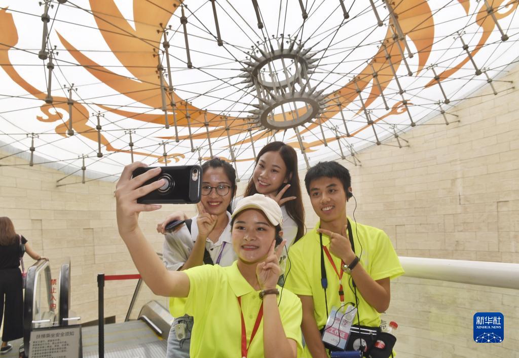 参加交流活动的香港青年(后排)在四川金沙遗址博物馆陈列馆有“太阳神鸟”图案的房顶前与志愿者(前排)合影留念(2019年8月25日摄)。新华社记者 刘坤 摄