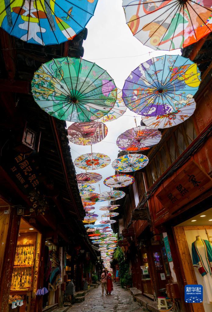 这是2021年8月19日拍摄的丽江古城内一条油纸伞装饰的巷子。新华社记者 陈欣波 摄