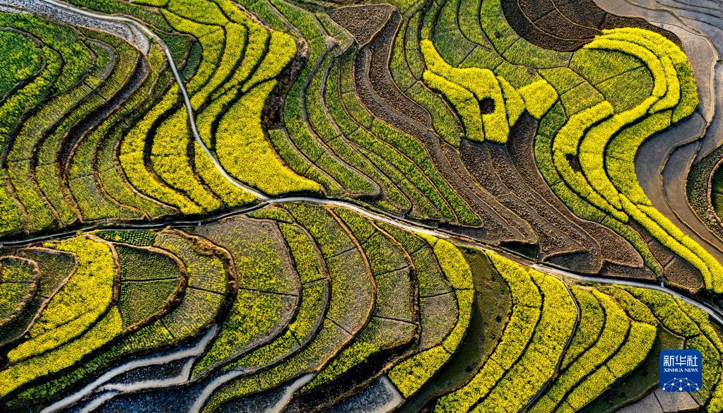 这是陕西省汉阴县漩涡镇凤堰古梯田里的油菜花(2020年3月18日摄,无人机照片)。新华社记者 陶明 摄