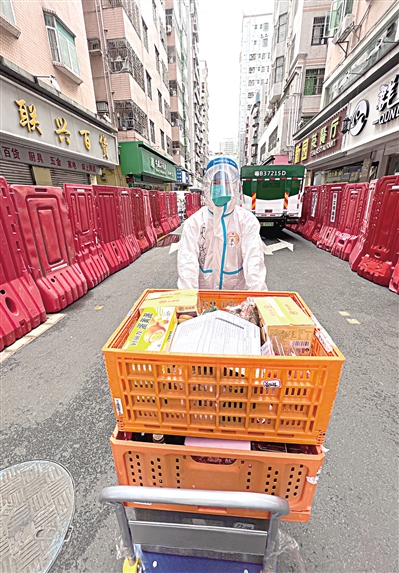 运送物资的工作,与采集核酸的完全不同。如果说采集核酸的志愿者的苦是被消毒水泡得发白的手,那运送物资的苦就是磨得满是水泡的脚。赖祥明运送物资的区域里共有224栋楼,分成了28个巷子,每个巷子都有一张外卖桌和储物货架。他每日推着搭载上百斤蔬菜、油、米等物资的小推车穿梭在这些巷子里,一推就是6个小时。中间如果累了,靠在推车上稍歇一会,便转身继续投入战斗。这样长时间的走路,导致防护服的脚套很容易被磨损,他不得不多套上一两层,才能不至于每层都被磨破。